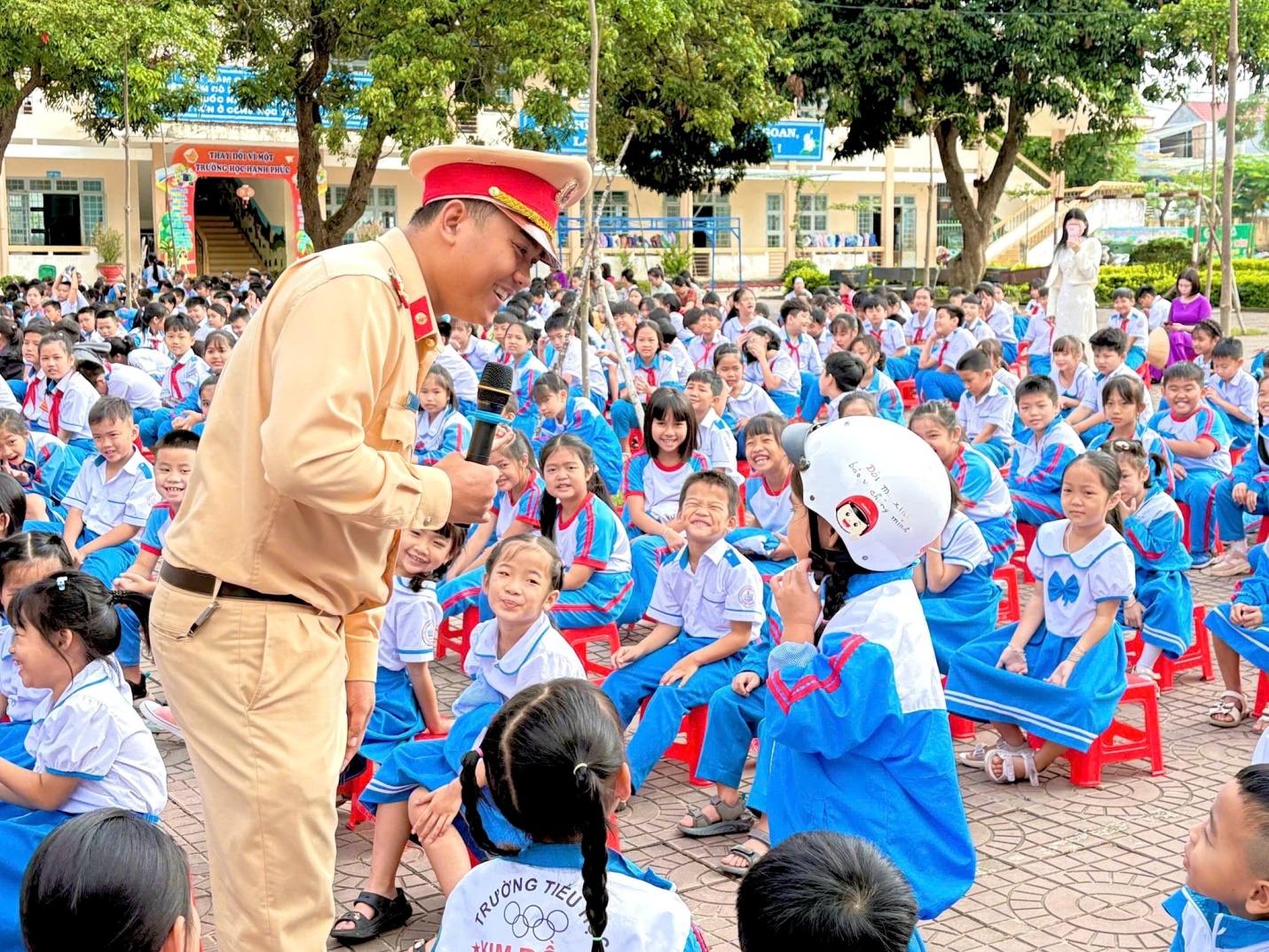 Sôi nổi buổi tuyên truyền an toàn giao thông cho học sinh Trường Tiểu học Kim Đồng do Phòng Cảnh sát giao thông Công an tỉnh Quảng Ngãi tổ chức