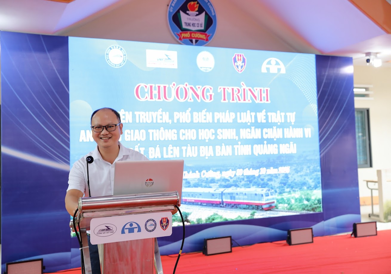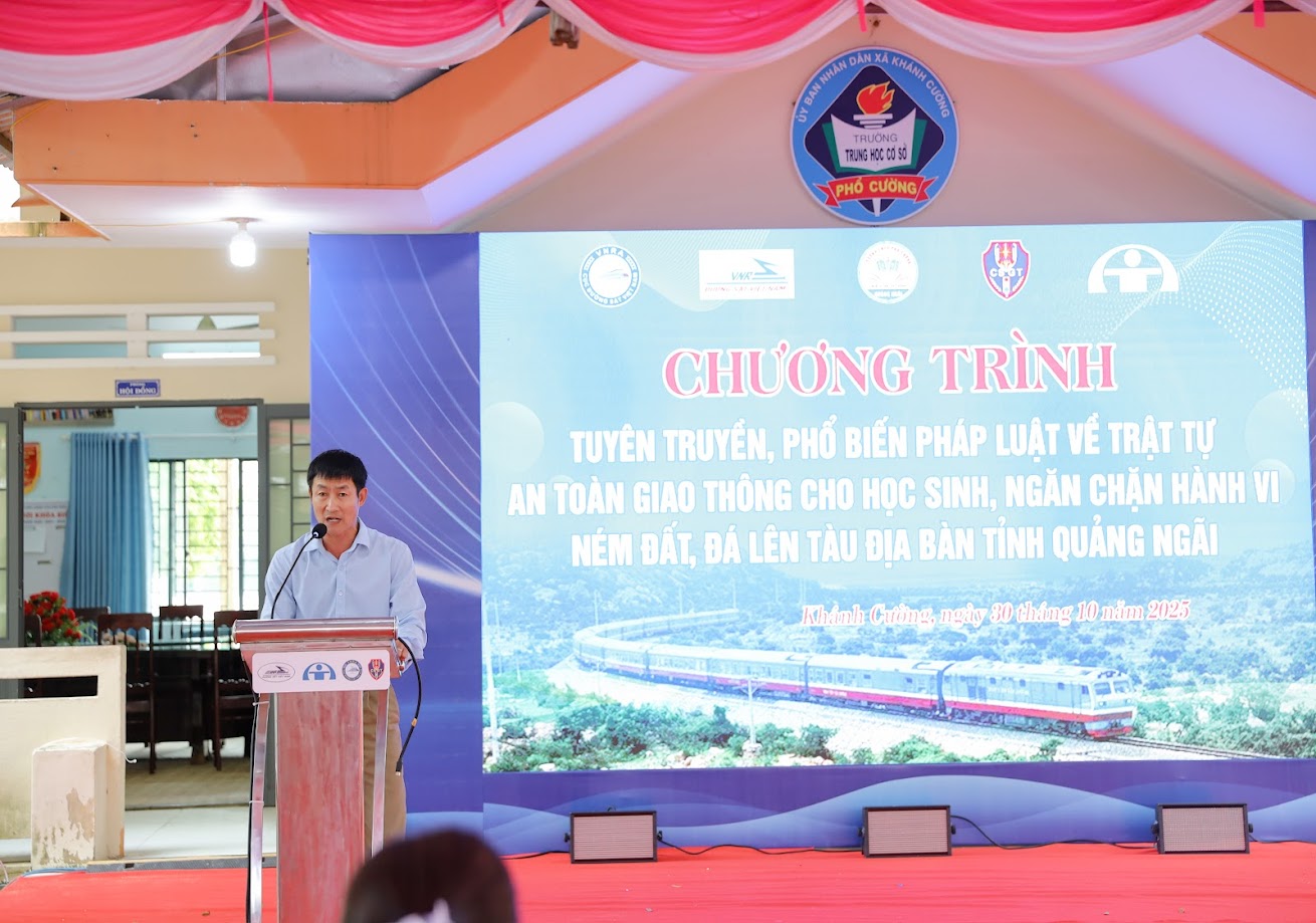Nhận thức rõ mức độ nghiêm trọng của tình trạng vi phạm hành lang an toàn giao thông đường sắt, đặc biệt là hành vi ném đất, đá lên các đoàn tàu – nguy cơ tiềm ẩn tai nạn, gây thương tích và thiệt hại lớn về tài sản – chiều ngày 30/10/2025, Trường THCS Phổ Cường (xã Khánh Cường, tỉnh Quảng Ngãi) phối hợp với Chi nhánh Khai thác đường sắt Nghĩa Bình long trọng tổ chức Hội nghị tuyên truyền, phổ biến pháp luật về trật tự an toàn giao thông đường sắt và ngăn chặn hành vi ném đất, đá lên tàu.