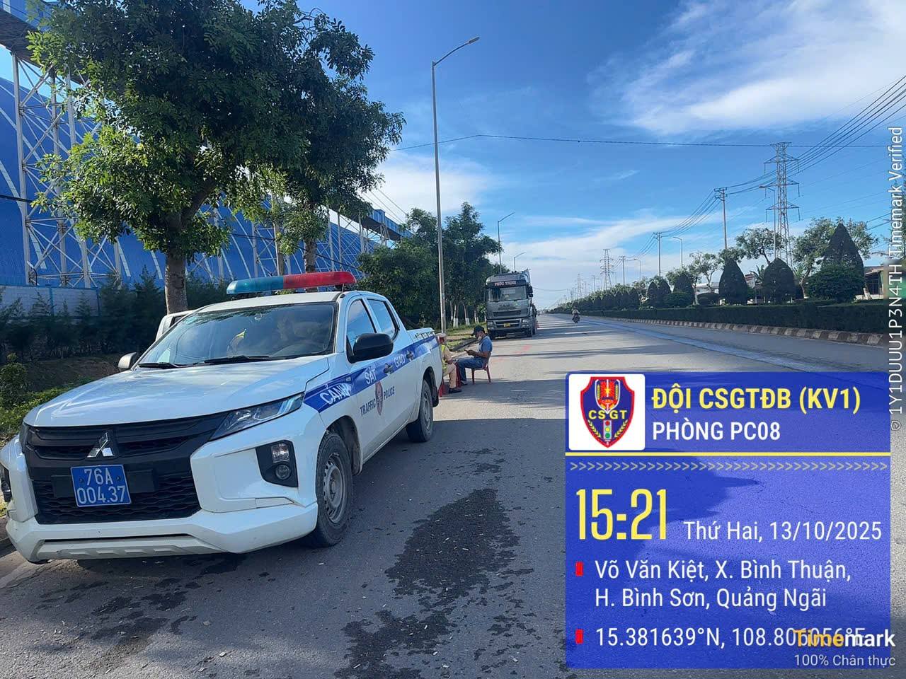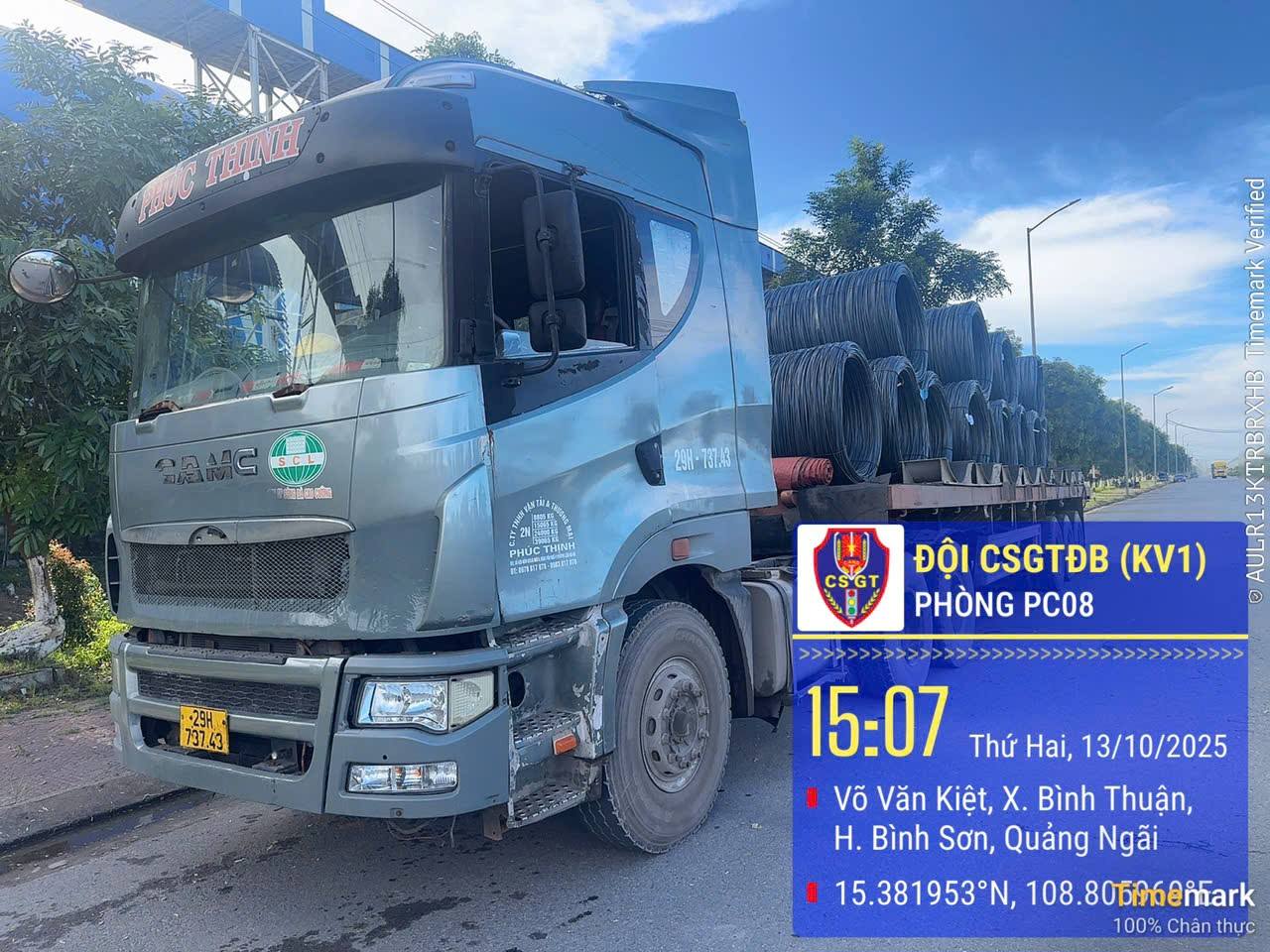 Cụ thể, chiều ngày 13/10/2025, Tổ tuần tra, kiểm soát khu vực 1, Đội Cảnh sát giao thông đường bộ số 1, Phòng Cảnh sát giao thông Công an tỉnh Quảng Ngãi tuần tra tuyến đường Võ Văn Kiệt, thuộc khu Kinh tế Dung Quất, xã Vạn Tường phát hiện xe ô tô đầu kéo, biển số 29H-737.43, kéo theo rơ mooc, biển số 29R-05233 lưu thông tuyến đường Võ Văn Kiệt, trên xe chở 13 cuộn sắt tròn chất thành 2 lớp nhưng không được chằng buộc chắc chắn, do lái xe Pha.n Vă.n Đ.ạt, sinh năm 1985, trú tại xã Bình Sơn, tỉnh Quảng Ngãi điều khiển.